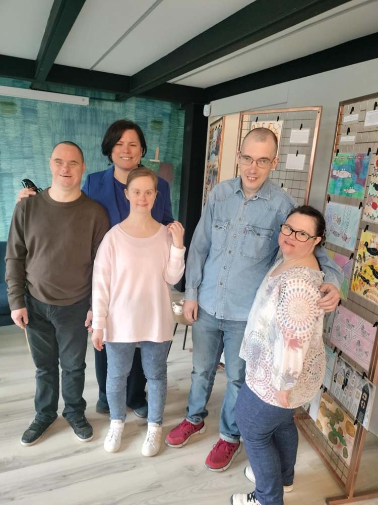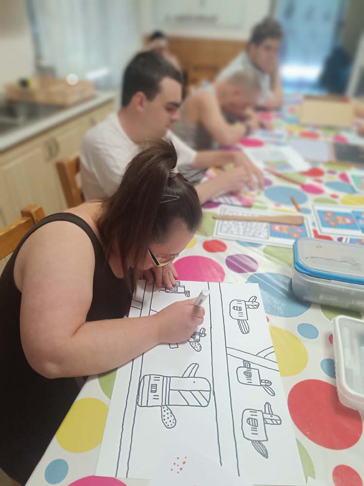 Kik ők? 11 fő, 23 és 49 év közötti, értelmi fogyatékossággal élő fiatalok. Vannak köztük, akik nagyon tehetségesen rajzolnak, vannak akik pedig más kézműves tevékenységben tudnak résztvenni, vannak ügyesebbek, és vannak kevésbé ügyesek. A közös azonban, hogy valamennyien részt vesznek a termékek előállításában, akár aktívan, akár csak egy részmozzanattal, akár csak azzal, hogy az eszközök előkészítésében, és elpakolásában segítenek többet.