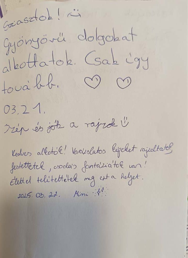 Lakóotthonunk fiataljai nemcsak mindennapjaikban, hanem az alkotásban is különlegesek: festményeik, rajzaik, kézműves munkáik egyedi világot, örömöt és színeket visznek a közösségünkbe és azon túl is.