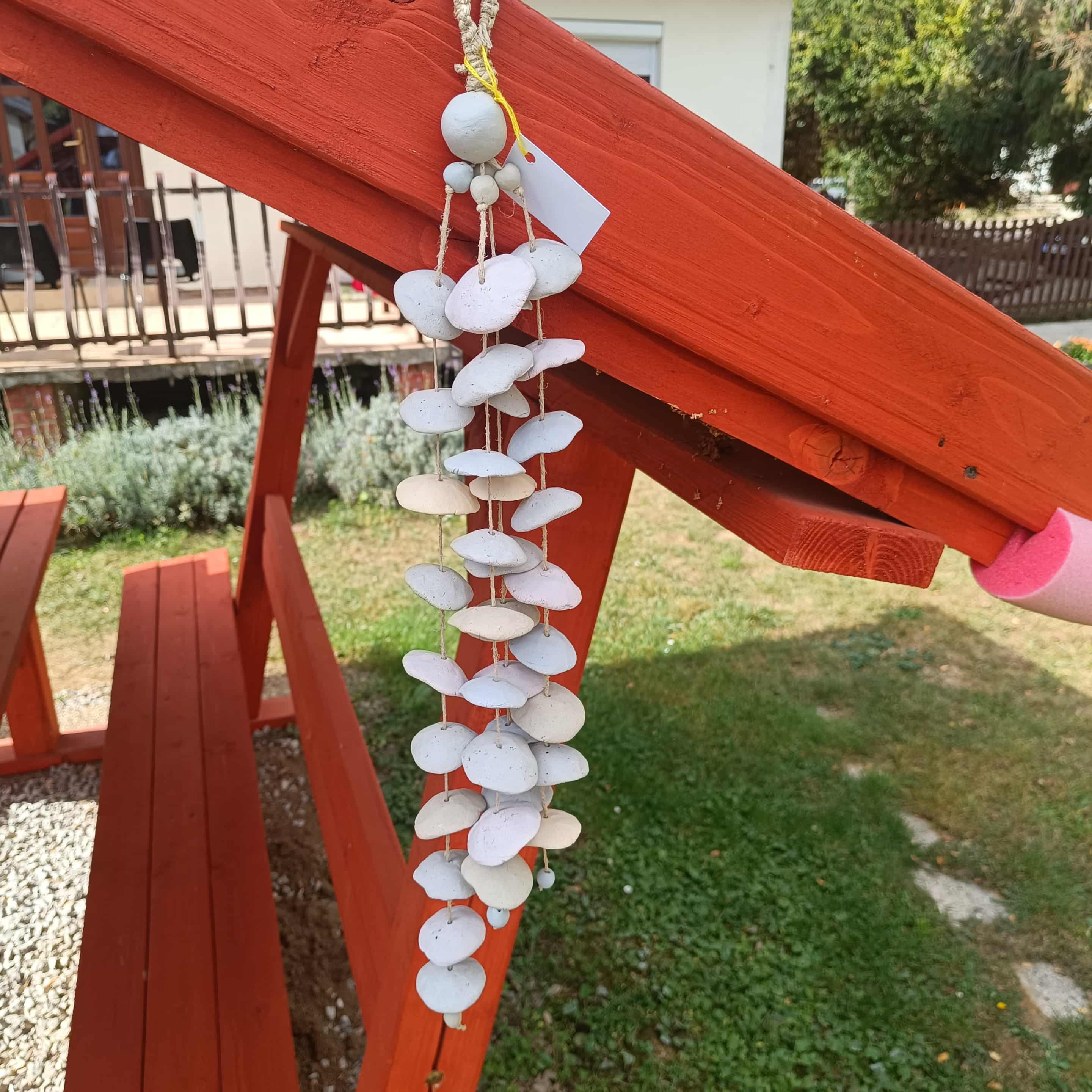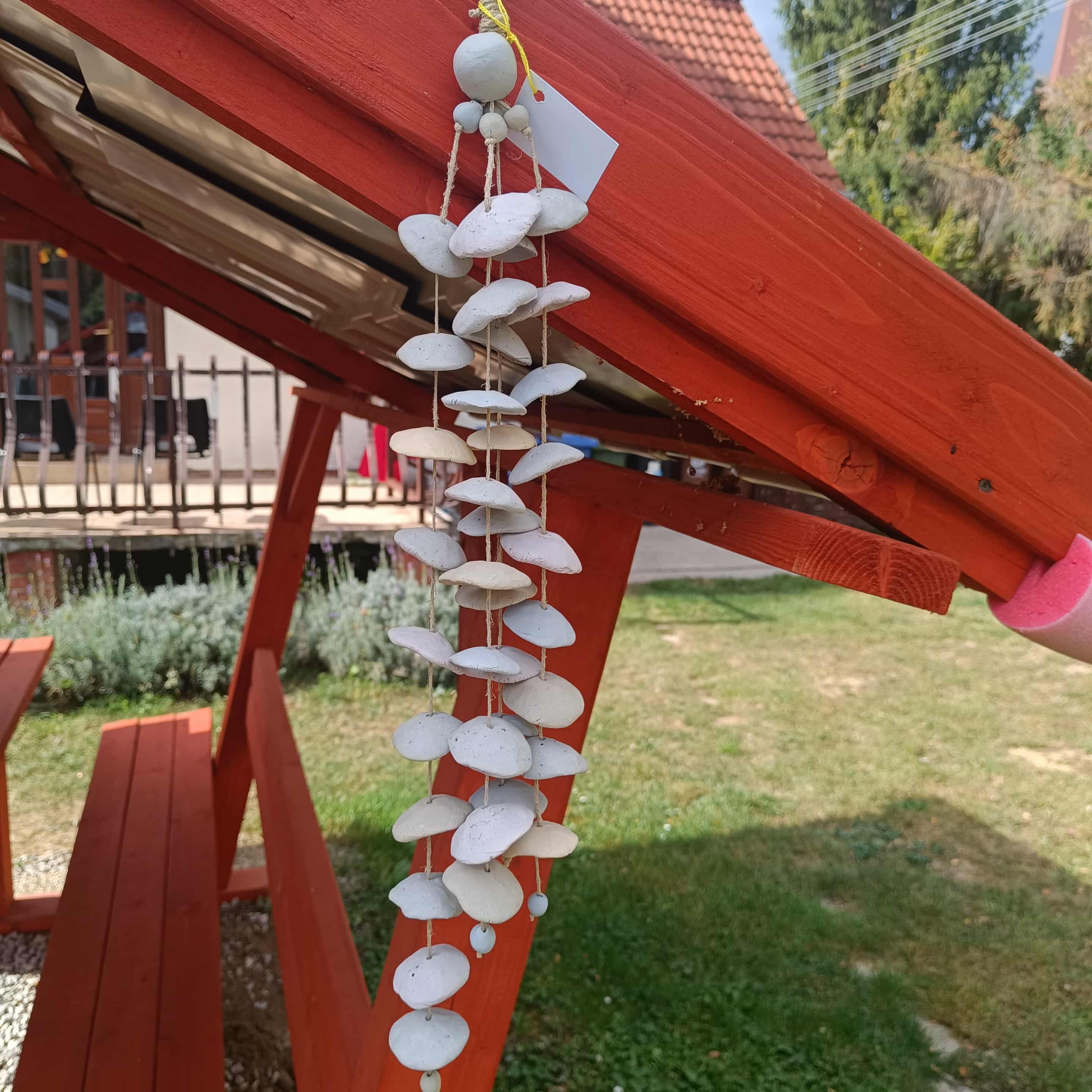Kerámia szélcsengő, minden darab egyedi, nincs több ugyanolyan. Teljes hossza 60 cm.